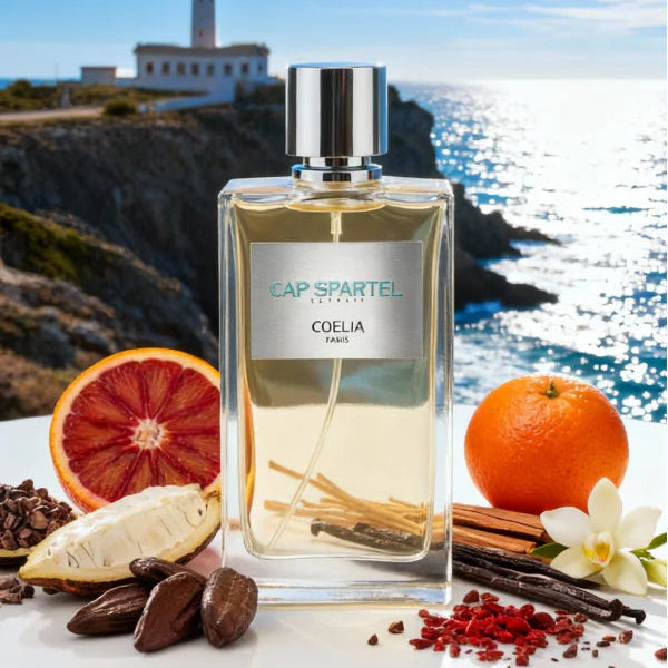 Cap Spartel is a luminous extrait de parfum inspired by Tangier, nestled between the Mediterranean and the Atlantic. Its sparkling opening of Blood Orange gives way to a gourmand heart of roasted Tonka and White Cacao. The base unfolds an elegant, enveloping trail of creamy Sandalwood, Vetiver, and Vanilla.